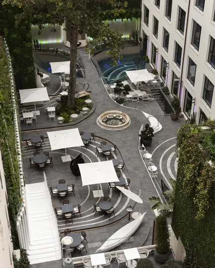 At the center of ROMEO Roma lies Il Cortile – a 1,000 sqm (10,000 sq ft) open-air garden that serves as the hotel’s vibrant heart and a serene escape from the city. The lush courtyard offers distinct spaces for lunch, dinner, and all-day dining, as well as quiet moments lounging by the pool. The sound of flowing echoes throughout the space, creating a calming atmosphere the promotes tranquility and relaxation.